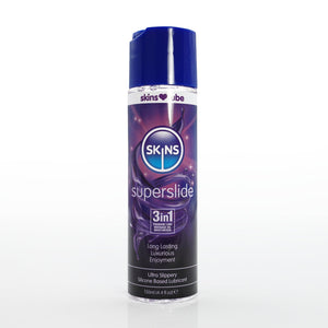 Skins Superslide shower lube contains 100% pure grade silicone lubricant making it ultra-long lasting. Silicone will not harm latex and is perfectly safe for internal use as silicone molecules are too big to enter the body through the skin or body linings. Just remember not to use silicone with silicone toys.
