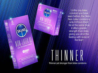 Skins non latex condoms in XL sizing give you the room you need, the comfort you want and the intimacy you crave. With these extra large condoms, you never have to pick between feeling good, feeling safe or feeling close. You can simply enjoy it all.