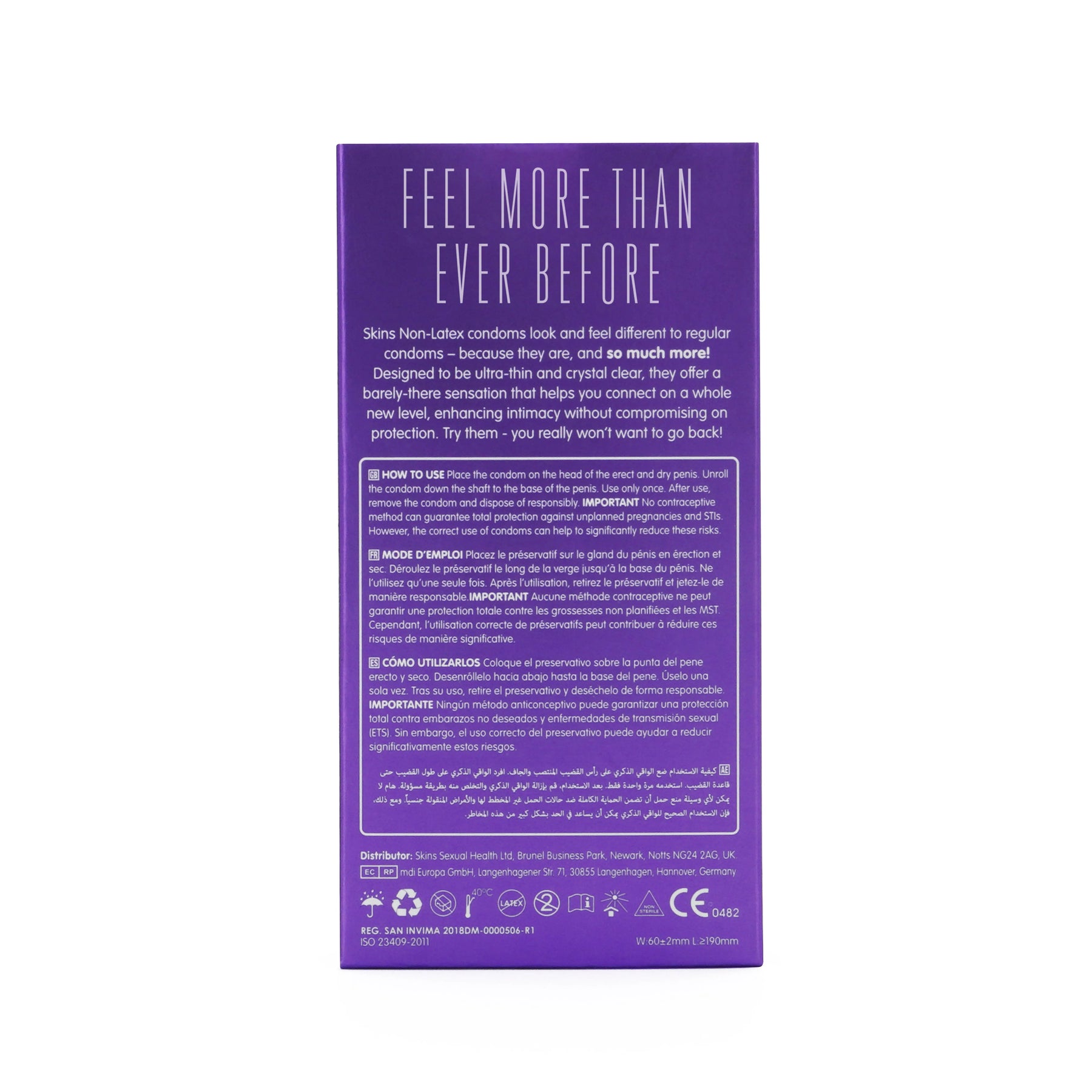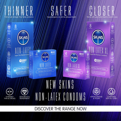 Skins latex free condoms are odourless, hypoallergenic and vegan friendly, making them suitable for sensitive skin and anyone who prefers a modern alternative to latex.