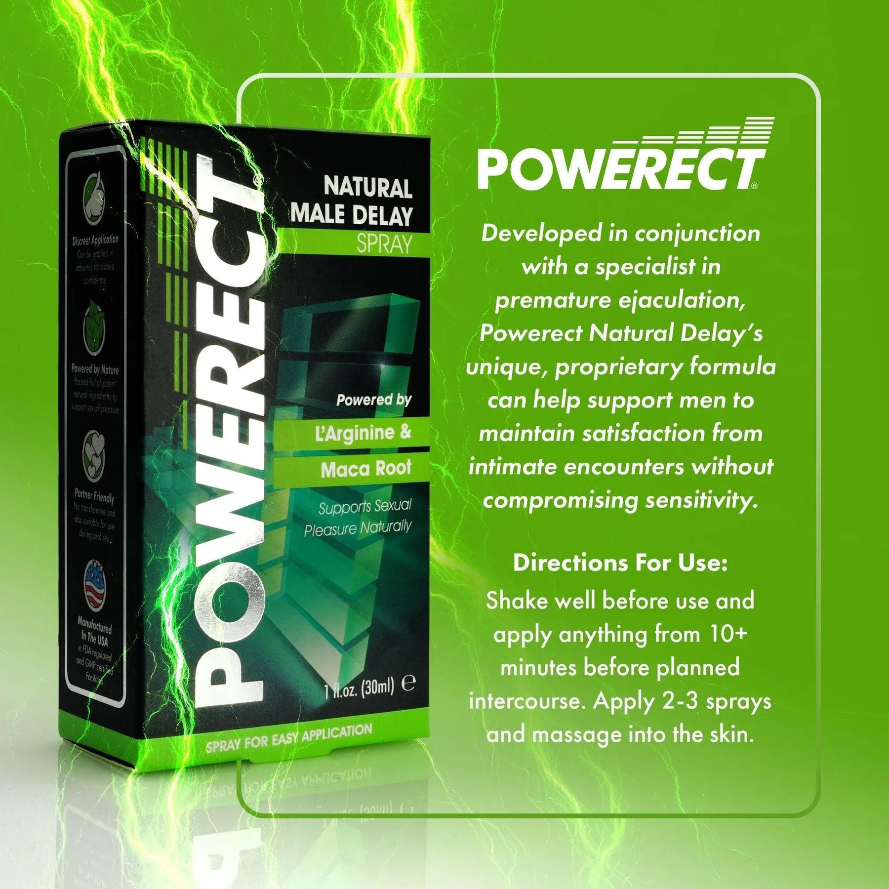 Shake well before use, and apply anything from 10+ minutes before planned intimacy. Apply 2 to 3 sprays and then massage into the head and shaft of the penis. The number of sprays and timing depends on the individual.